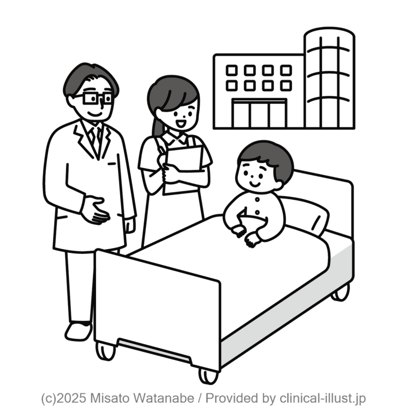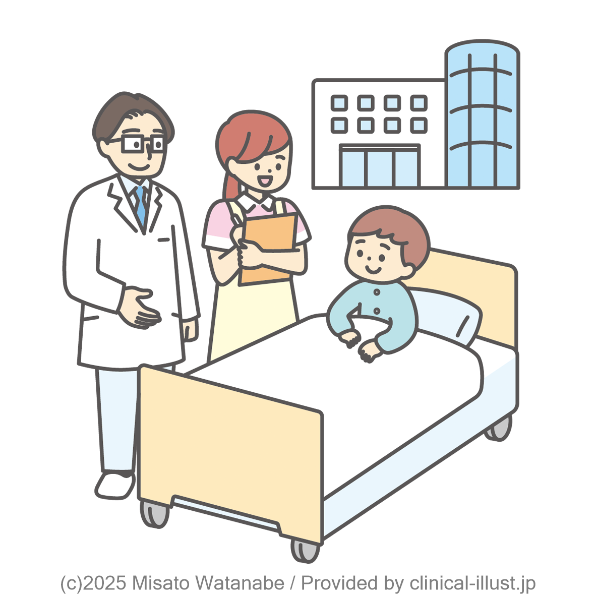病院のベッドで、子どもが医師・看護師とお話するイラストです。