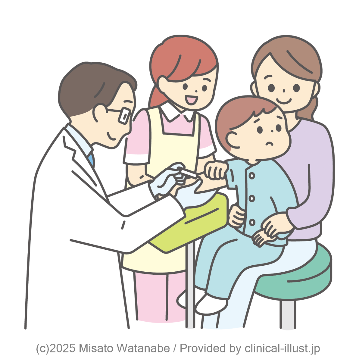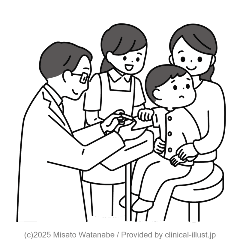 お母さんの膝の上で頑張る子ども、保定する看護師、採血を行う医師のイラストです。